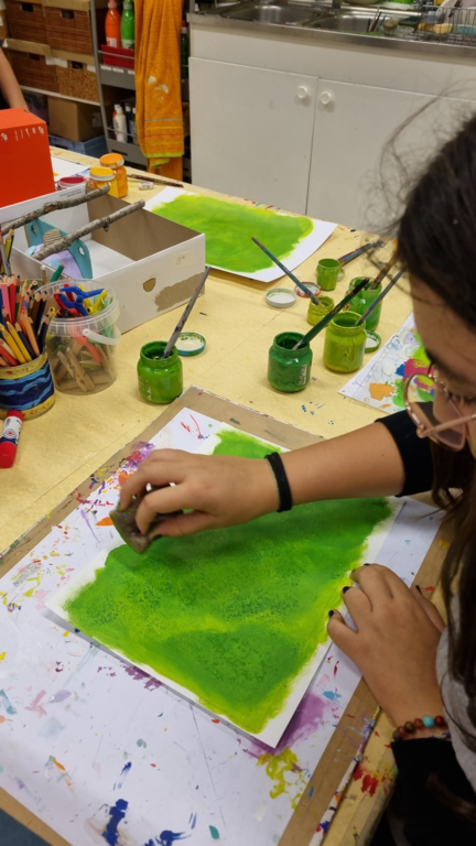 Pour commencer, réalisation d'un insecte volant sur une base carton et travail de superposition de peintures et de tampons avec des matériaux de récup' bien sûr!